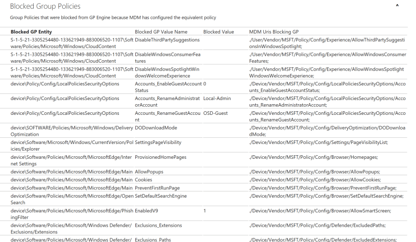 - Any values set by scripts/user outside of GP that conflict with MDM are removed