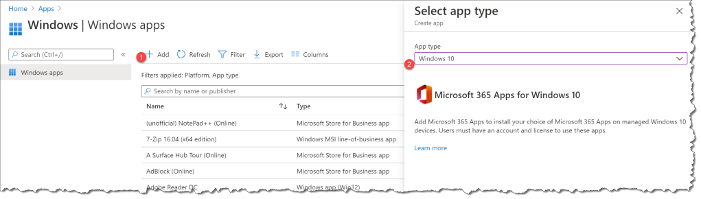 Create Windows app (Win32)in Intune and add package -> OfficeSetupProject-US-en.intunewin