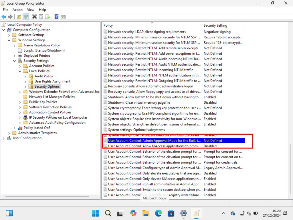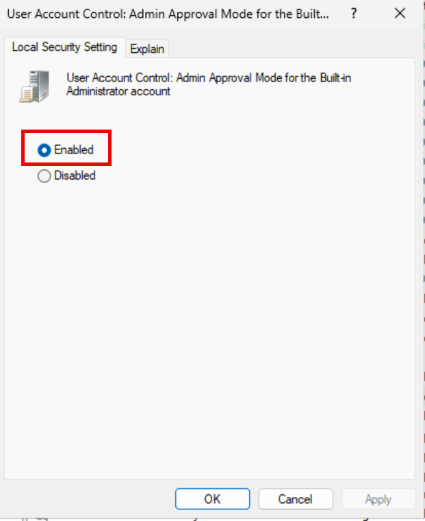 Browse to Computer Configuration – Windows Settings – Security Settings – Local Policies – Security Options then click on User Account Control Admin Approval Mode for Built-in Administrator Account