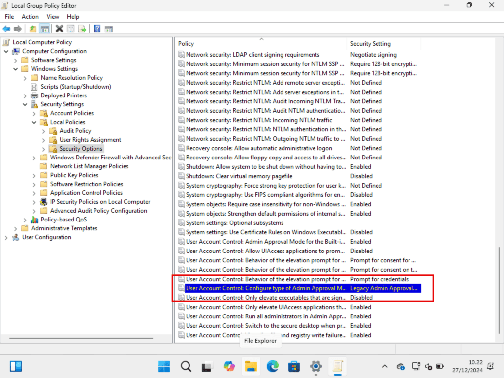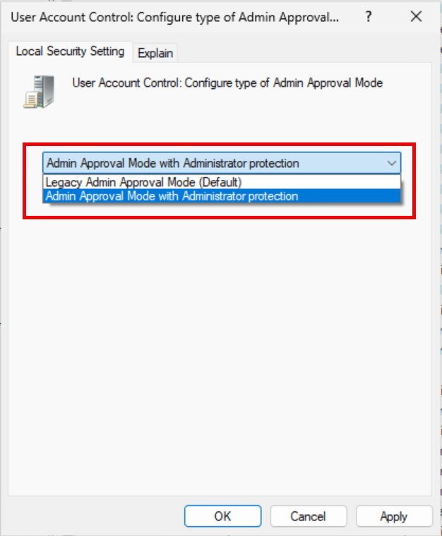 Browse to Computer Configuration – Windows Settings – Security Settings – Local Policies – Security Options then click on User Account Control Configure type of Admin Approval Mode.