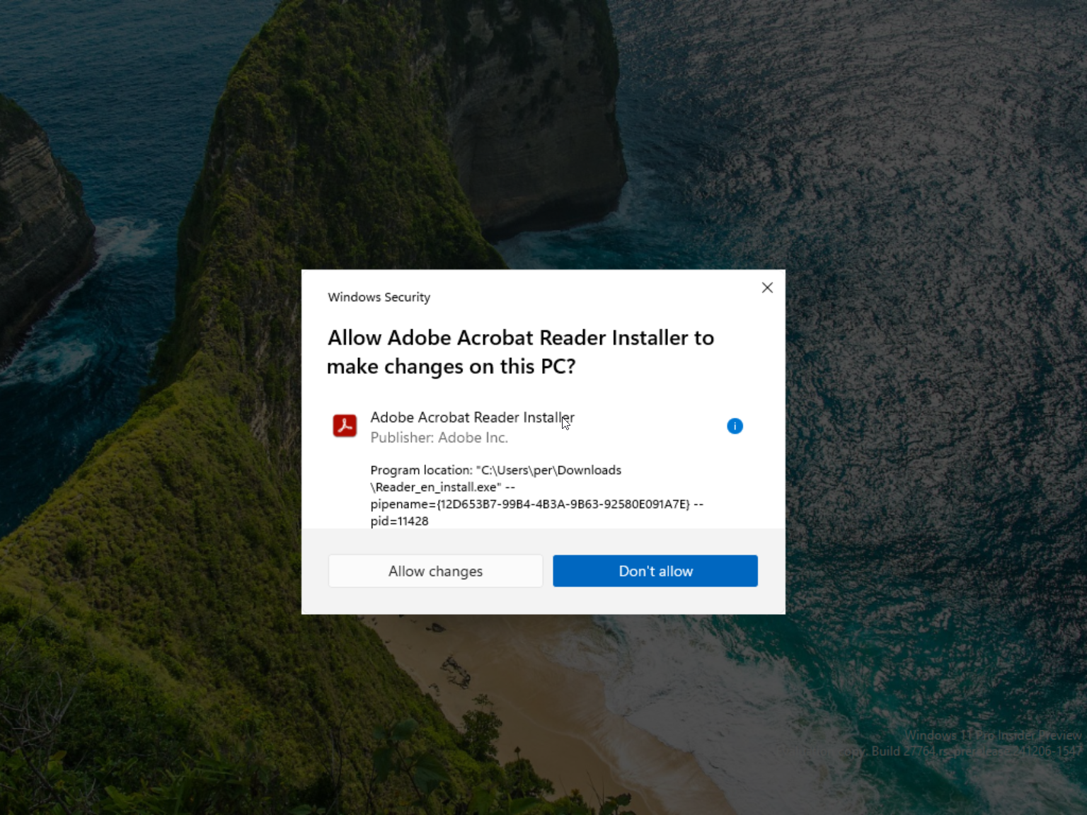 You will see a new and improved Windows Security prompt that are asking you to Allow changes, you are also getting the information about the installer, the publisher, if you click on the information icon you also gets the command line that will be executed.